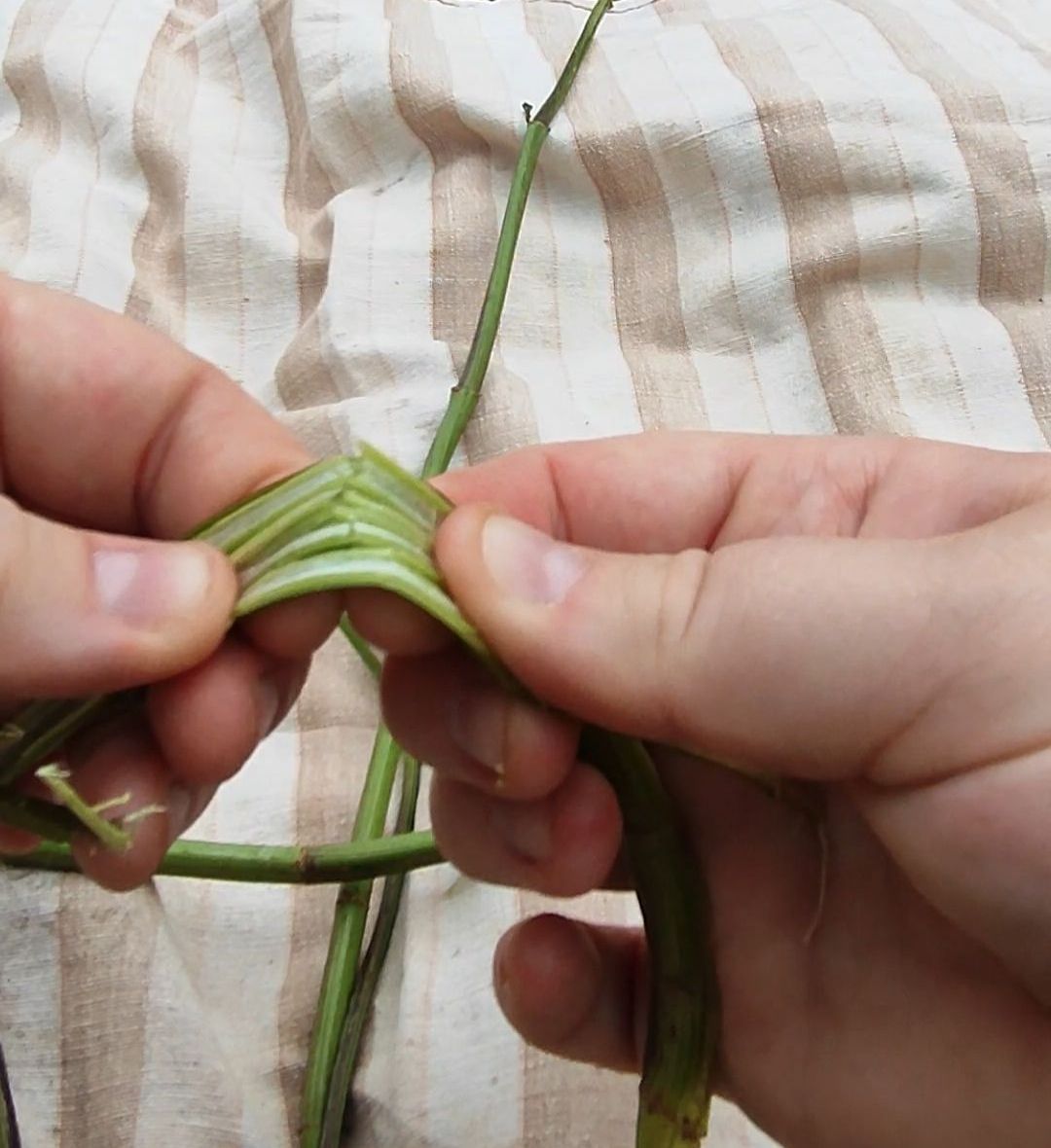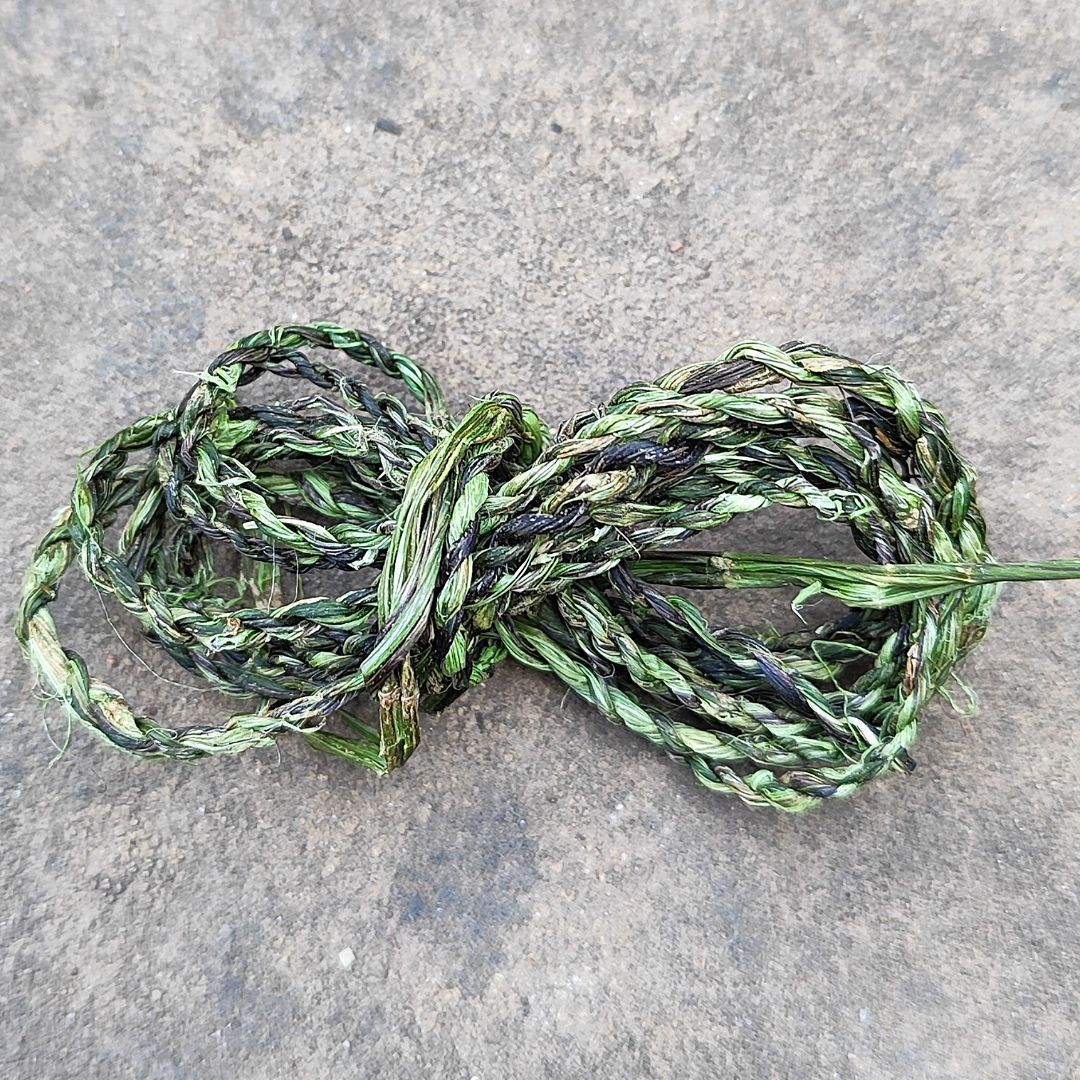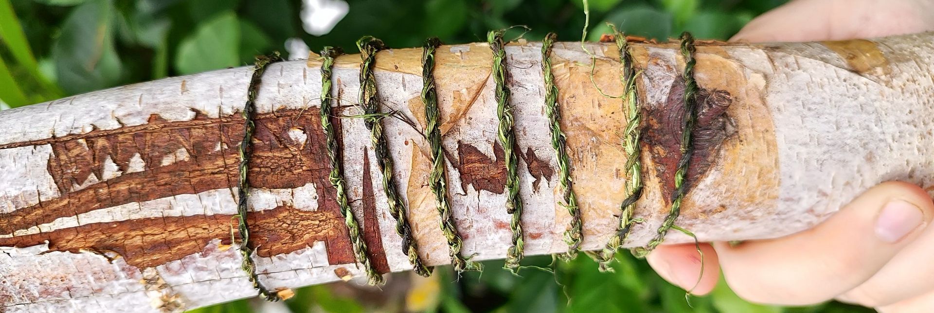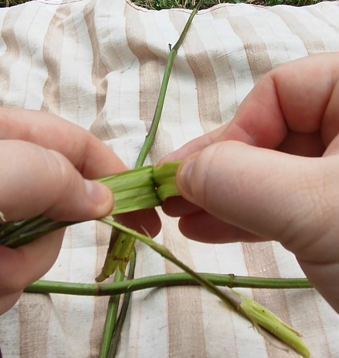 5 . Nun kann man die Fasern trocknen lassen, sofort loslegen geht aber auch. Man nimmt eine der langen geschälten Fasern und faltet diesen bei zweidrittel Länge ein. Dann geht’s los mit dem Eindrehen. Die vordere Faser wird nach vorne eingedreht und dann über die andere nach hinten gelegt. Dann wird die Faser, die nun vorne ist, wieder nach vorne gedreht und ebenfalls nach hinten gelegt. Diese zwei Schritte wiederholen sich jetzt immer weiter. So lange bis einer der Fasern nur noch ca. 10 cm lag ist. Dann kann eine neue Faser mit eingedreht werden. Ihr dreht nun so lange weiter ein, bis ihr die gewünschte Länge erreicht habt.