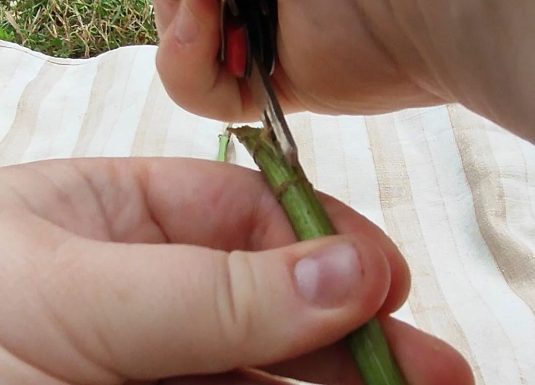 3 . Danach muss die Brennnessel einmal der Länge nach aufgespalten werden. Dafür könnt ihr eure Fingernägel oder aber ein Hilfsmittel nehmen, wie etwa Teile eines Multifunktionstaschenmessers. Dann spaltet ihr die Brennnessel einmal von unten soweit wie es geht nach oben auf.